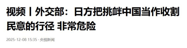 视频丨外交部:日方把挑衅中国当作收割民意的行径 非常危险 2025-12-08 15:35·央视新闻